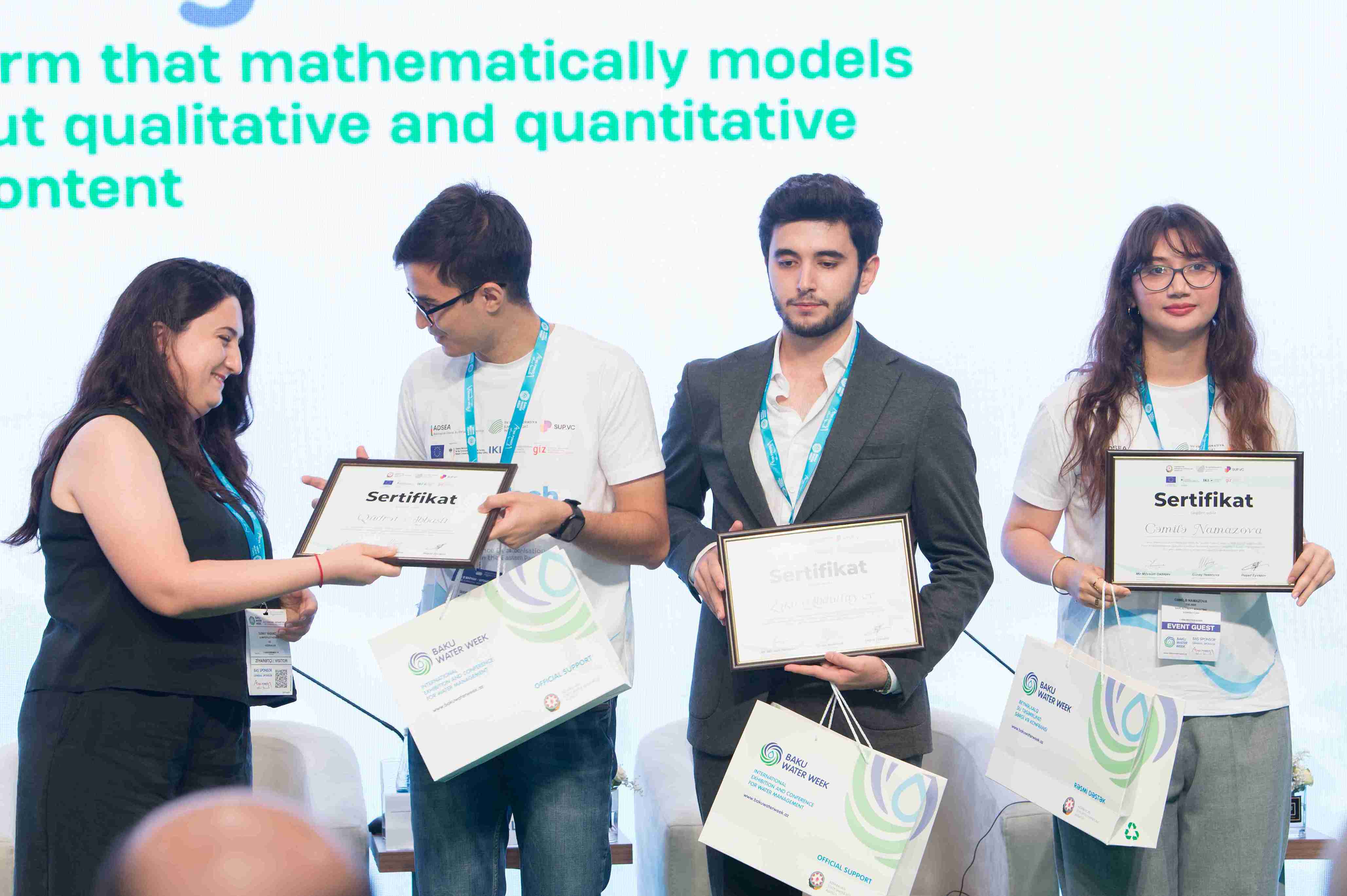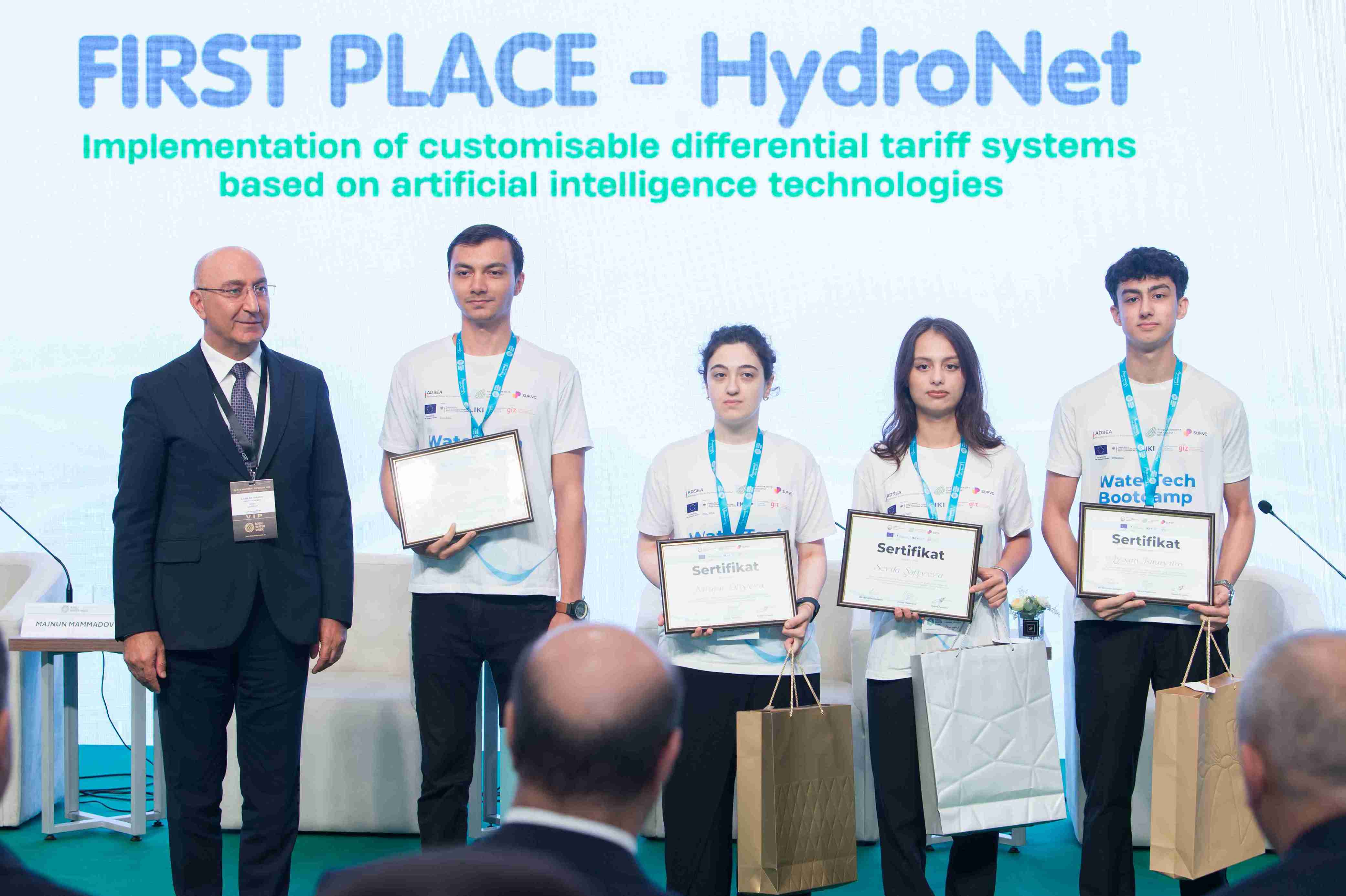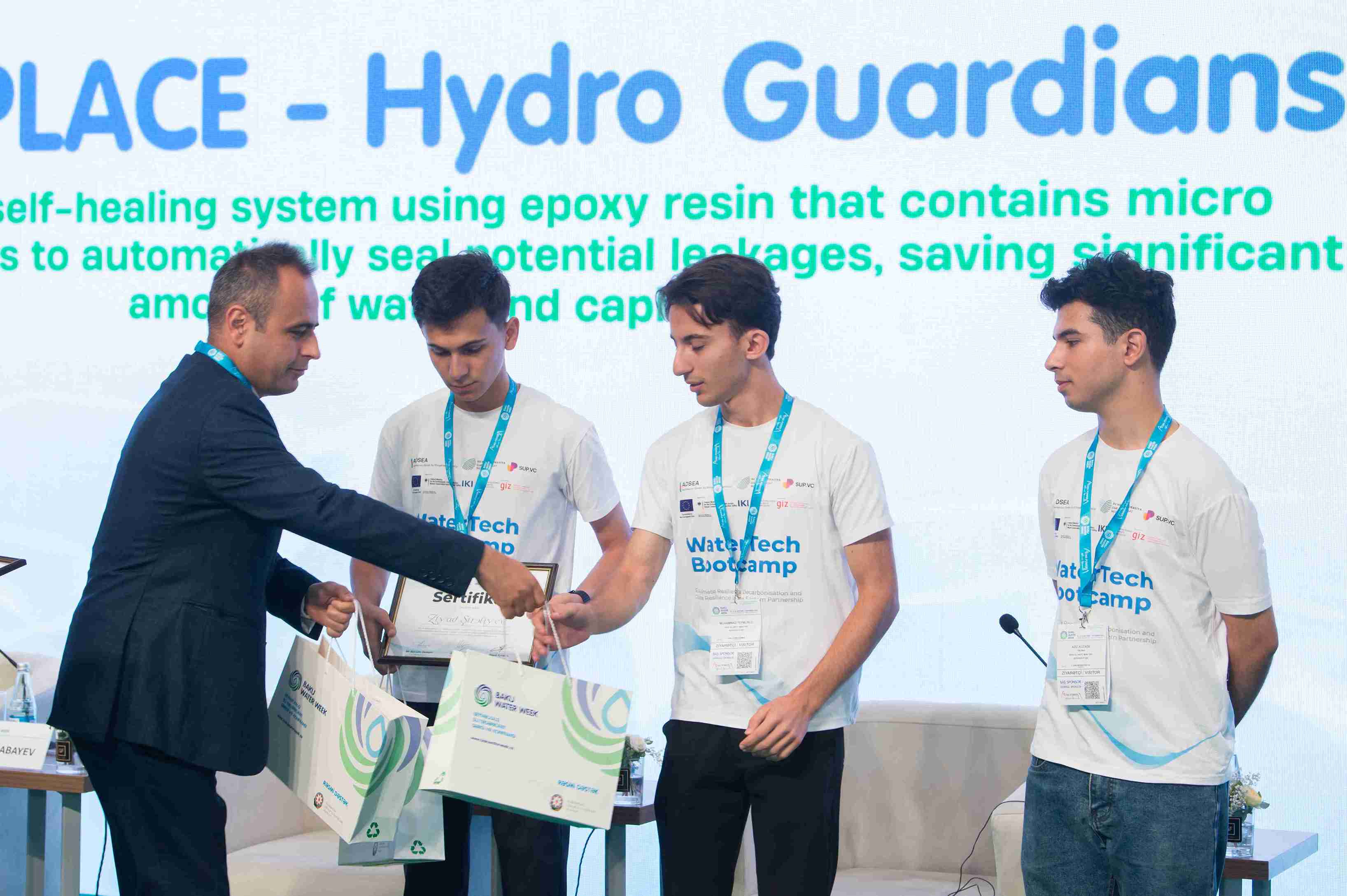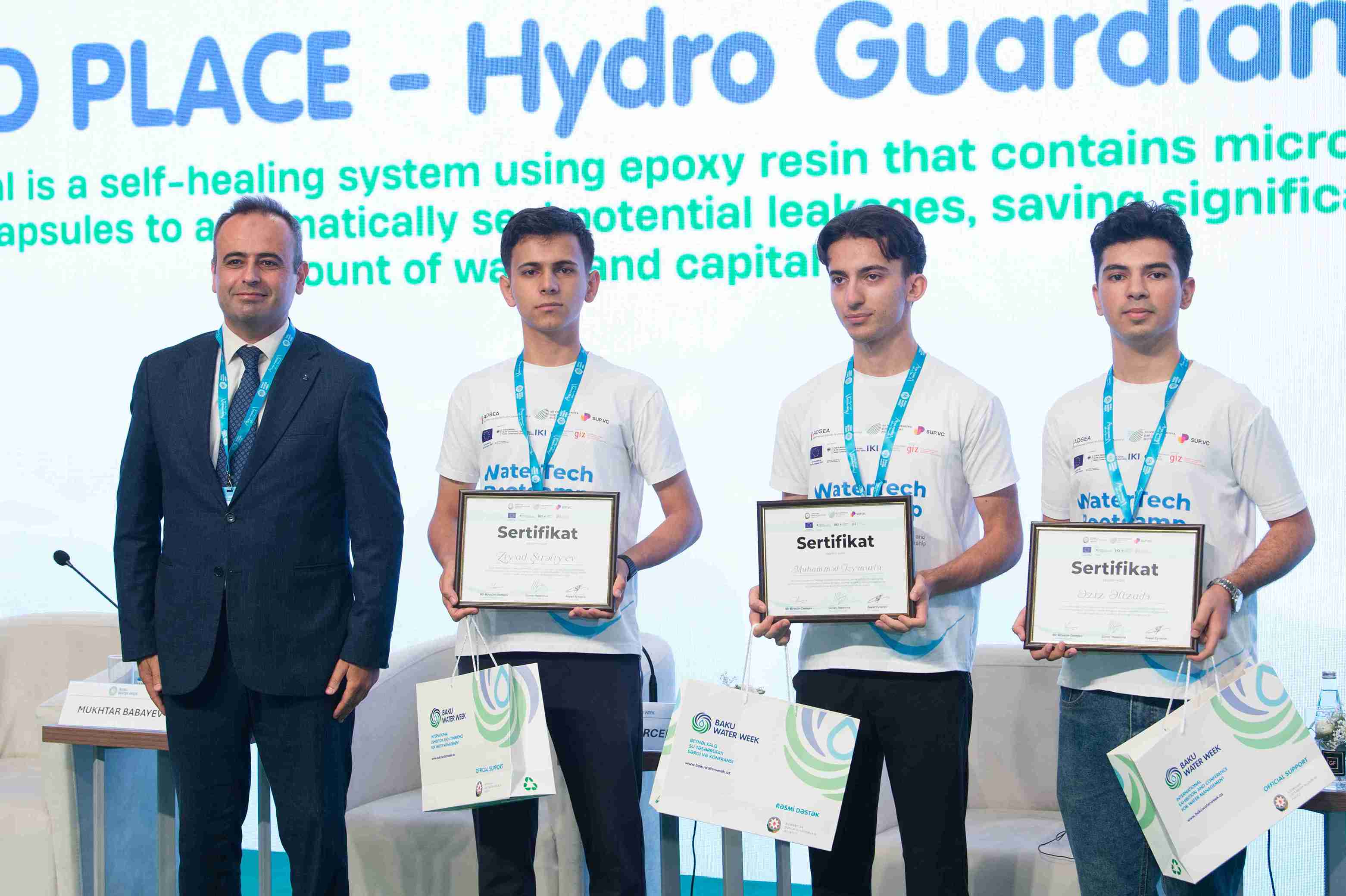 “Bakı Su Həftəsi” Konfransı çərçivəsində Azərbaycanda ilk dəfə keçirilən “WaterTech Bootcamp” hakatonunun qalibləri mükafatlandırılıb. Birinci yerə layiq görülən HydroNET komandasına mükafatı Azərbaycan Dövlət Su Ehtiyatları Agentliyinin sədr müavini İlham Bayramov, ikinci yerin sahibi Zəngəzur BANM komandasına GİZ-in iqlim siyasəti üzrə məsləhətçisi Günay Həsənova, üçüncü yer qalibi Hydro Guardians komandasına isə SUP VC şirkətinin icraçı direktoru Rəşad Eyvazov tərəfindən mükafat təqdim olunub.